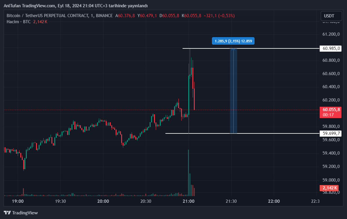 Bir anda 61 bin dolar seviyesindeki dirence kadar %2’lik ani bir sıçrama gerçekleştiren BTC, bu direnç seviyesinden reddedilerek tekrar düşüş yaşadı.