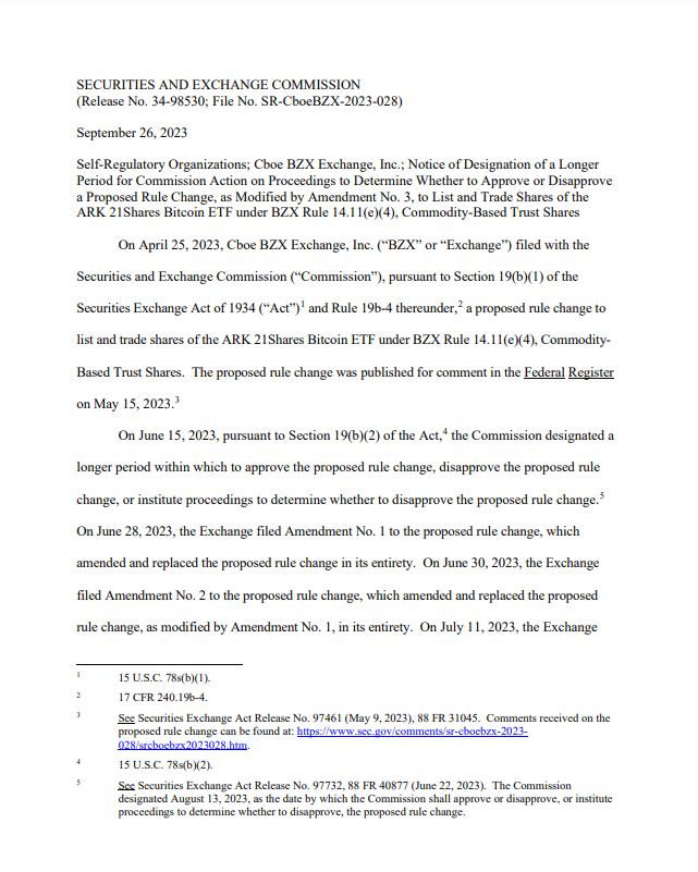 UPDATE: Wow. The SEC just came out SUPER early and delayed the @ARKInvest / @21Shares #Bitcoin ETF filing. This thing wasn't due for a decision until Nov 11.