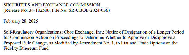 Son dakikalarda gelen bilgilere göre ABD Menkul Kıymetler ve Borsa Komisyonu (SEC), Fidelity‘nin spot Ethereum ETF opsiyon başvurusunu erteledi. Aktarılanlara göre yeni SEC yönetimi bu ETH ETF opsiyon başvurusu ile ilgili nihai kararını 9 Nisan 2025 tarihinde verecek.