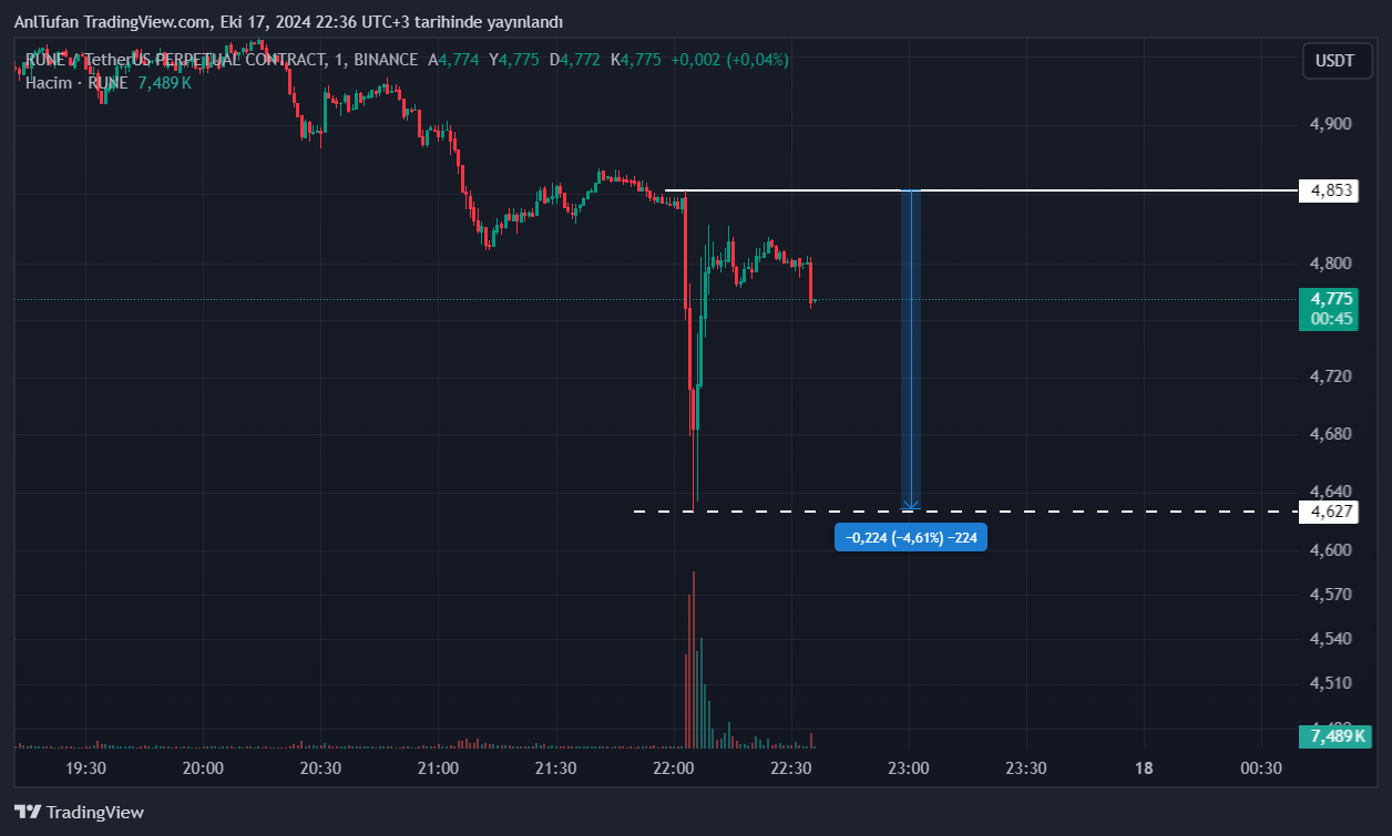 Haberin paylaşılmasının ardından RUNE 4.85 dolar seviyelerinden 4.62 dolara kadar %5’lik bir düşüş yaşadı. RUNE dakikalar içerisinde bir miktar toparlansa da, halen son düşüşlerin tamamını telafi edememiş durumda.