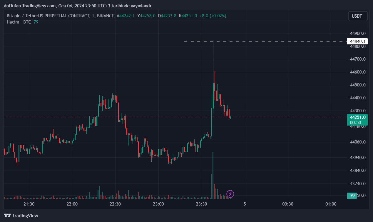 Bu gelen haber ile birlikte lider kripto para birimi Bitcoin’de (BTC) ani bir artış yaşandı. Yine de BTC 44.840 dolara kadar bir sıçrama yapmış olsa da, satış baskısı ile karşı karşıya kaldı.
