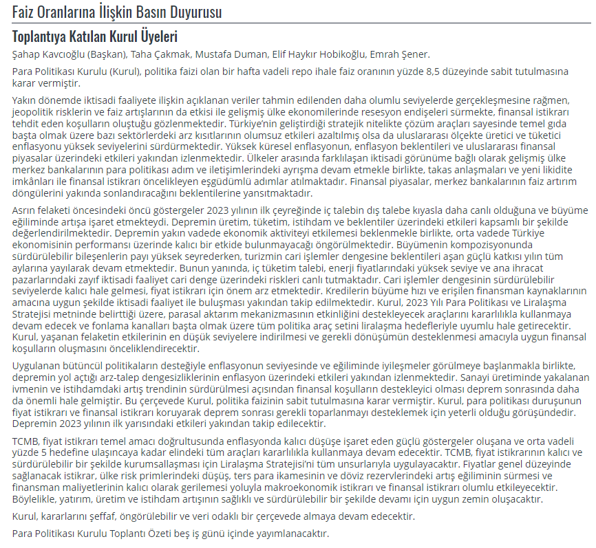 Geçtiğimiz dakikalarda ise Türkiye Cumhuriyeti Merkez Bankası (TCMB) yeni faiz kararını açıkladı. Piyasa gözlemcileri faiz oranlarının yüzde 8.5 seviyelerinde sabit tutulmasını bekliyordu.
