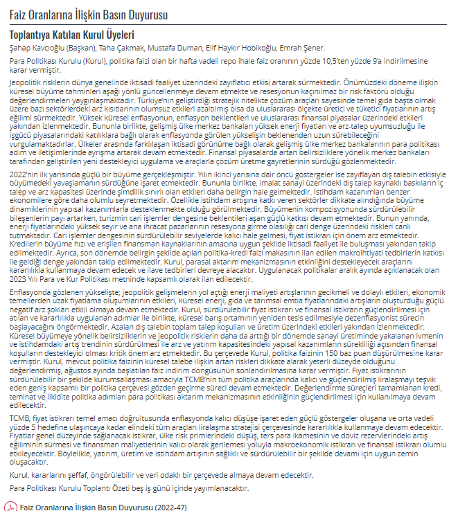 Türkiye Cumhuriyeti Merkez Bankası (TCMB), son alınan karar hakkında web sitesi üzerinde şu gerekçeyi aktardı: