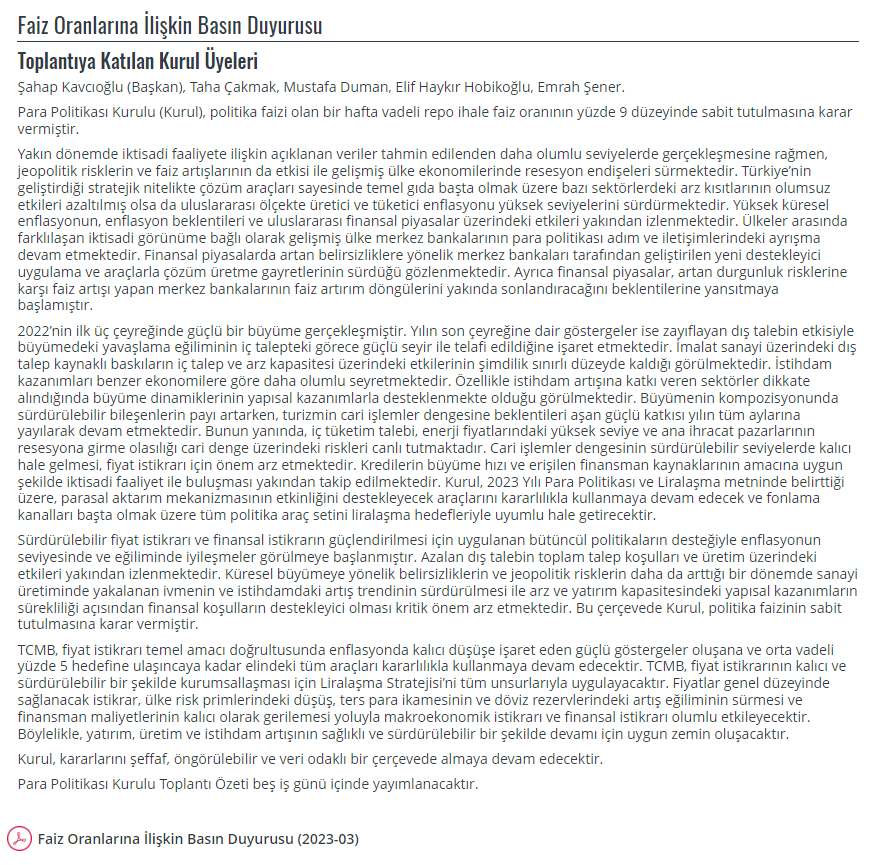 “Para Politikası Kurulu (Kurul), politika faizi olan bir hafta vadeli repo ihale faiz oranının yüzde 9 düzeyinde sabit tutulmasına karar vermiştir.”