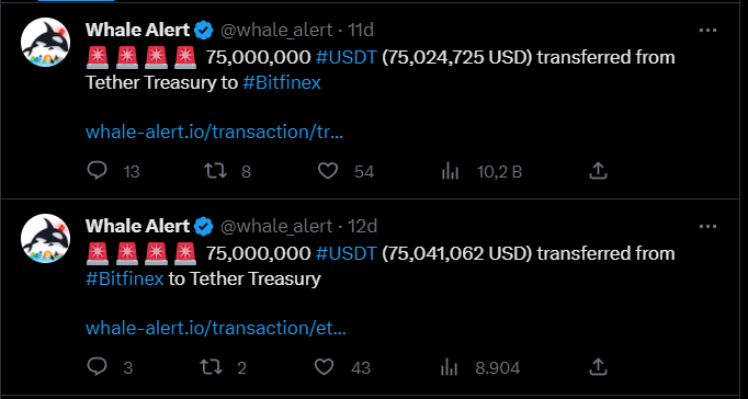Bu gelişmelerin haricinde son dakikalarda 75 milyon USDT önce Bitfinex’den Tether hazinesine, ardından ise Tether hazinesinden geri Bitfinex’e aktarıldı. Bu konu ile ilgili herhangi bir açıklama gelmedi.