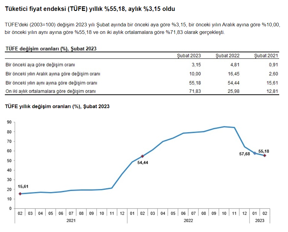 Geçtiğimiz dakikalarda Türkiye İstatistik Kurumu (TÜİK) son enflasyon verisini açıkladı. Enflasyon oranları beklentilerin (yüzde 55.50) çok ufak miktarda altında gelerek yüzde 55.18 olarak açıklanmış durumda.