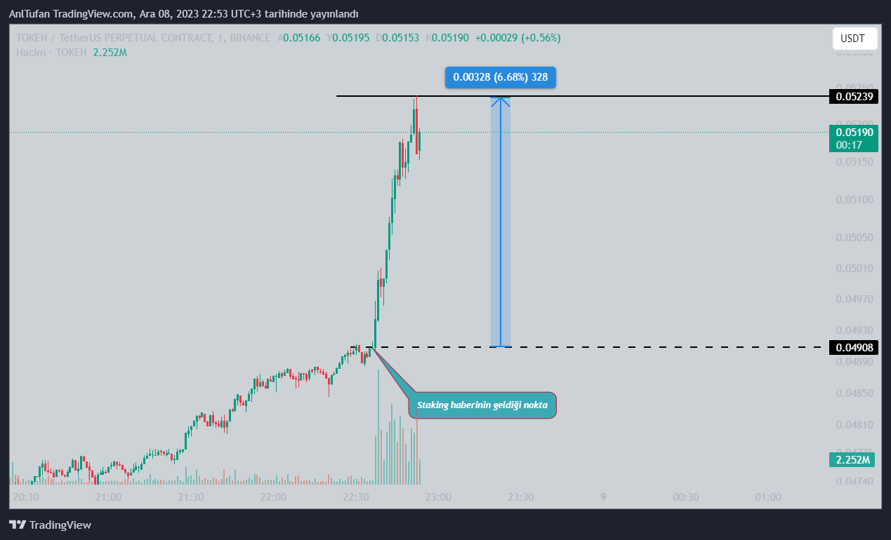 Bu son gelişme ile birlikte TOKEN’in yukarı yönlü hareketler sergilediği gözlemlendi. TOKEN gelen haber sonrasında kısa bir süre içerisinde %7’ye yakın bir artış gerçekleştirdi.
