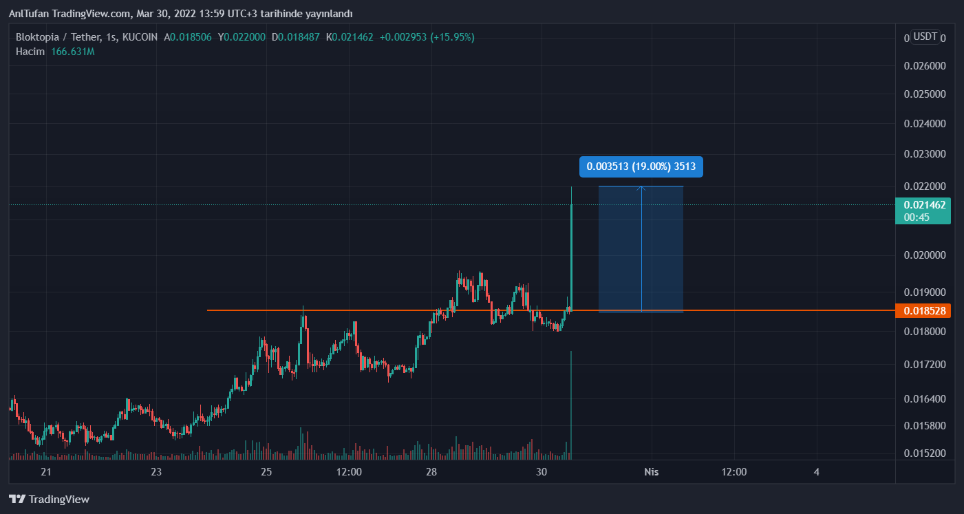 Bloktopia bu listeleme tweet’inin ardından sonra ise çok sert bir şekilde yükselmeye başladı. Tweet paylaşıldığında 0.018500 dolar seviyelerinde bulunan BLOK, dakikalar içerisinde 0.02200 dolar seviyelerine ulaştı.