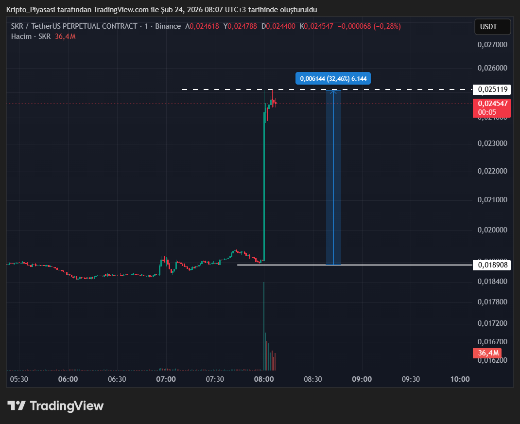 Bu listeleme sonrasında SKR fiyatında anlık %32’lik bir sıçrama meydana geldi. An itibariyle 0.0242 dolardan işlem gören SKR, sert hareketlerine devam edebilir.