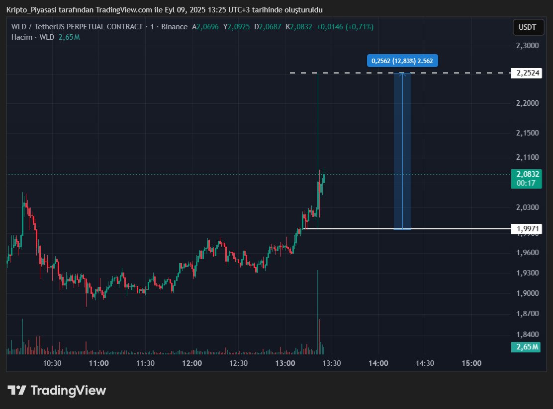 Upbit’in son listeleme duyurusu sonrası Türk yatırımcıların da yakın takibinde olan WLD, ani bir yükseliş yaşadı. WLD’nin son dakikalarda %10’dan fazla değer kazandığı gözlemlendi.