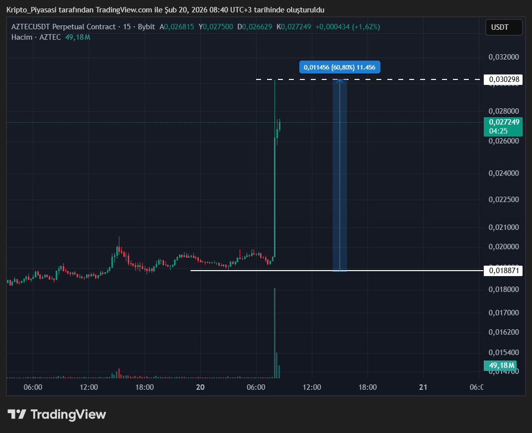 Dakikalar içerisinde %60 oranında değer kazanmayı başaran AZTEC, 0.0302 dolar seviyelerine kadar yükseldi. AZTEC an itibariyle ise 0.0272 dolardan işlem görüyor.
