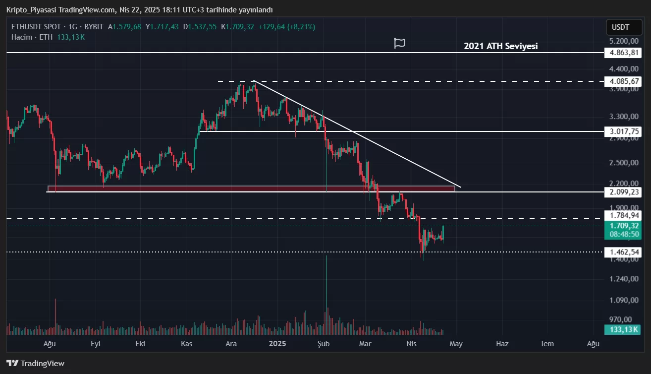 Ethereum (ETH) haberimizin yazıldığı esnada 1.710 dolar seviyelerinden işlem görüyor. Son yaşanan yükselişler ile birlikte gözünü 1.784 dolarda yer alan dirence çevirmiş gibi gözüken ETH, bu dirence bir deneme yapabilir.