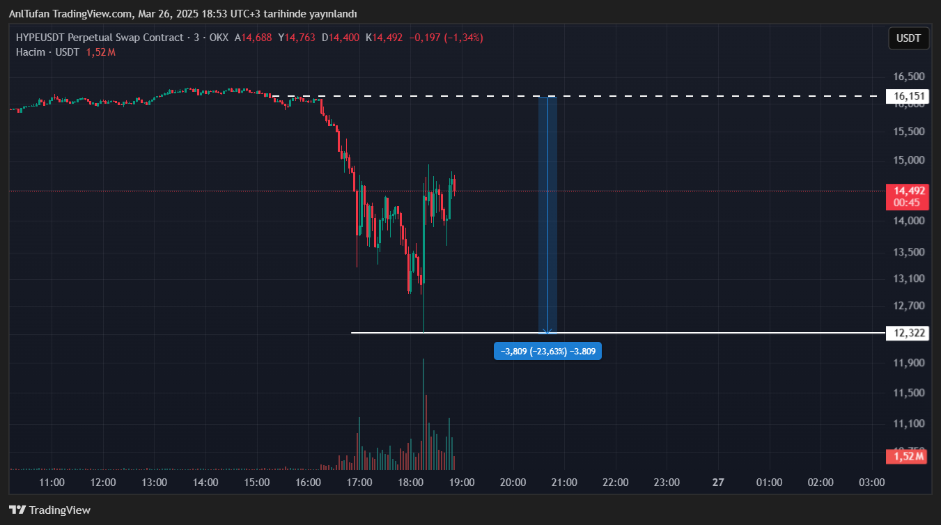 Bu JELLYJELLY kaosu neticesinde HyperLiquid’in yerel altcoin’i olan HYPE, çok sert düşüşler yaşadı. Bir anda %25 oranında değer kaybeden HYPE, son dakikalarda ise toparlanıyor.