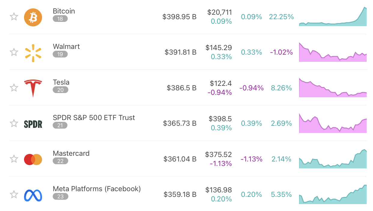 Son 2 hafta içerisinde yüzde 30 oranında değer kazanmayı başaran Bitcoin, birçok devasa şirketi geride bırakmayı başarmış durumda. İlk yükselişlerinde Meta ve Mastercard‘ı geçmeyi başaran BTC, son hamleleriyle ise Tesla‘yı da geride bırakmış durumda.