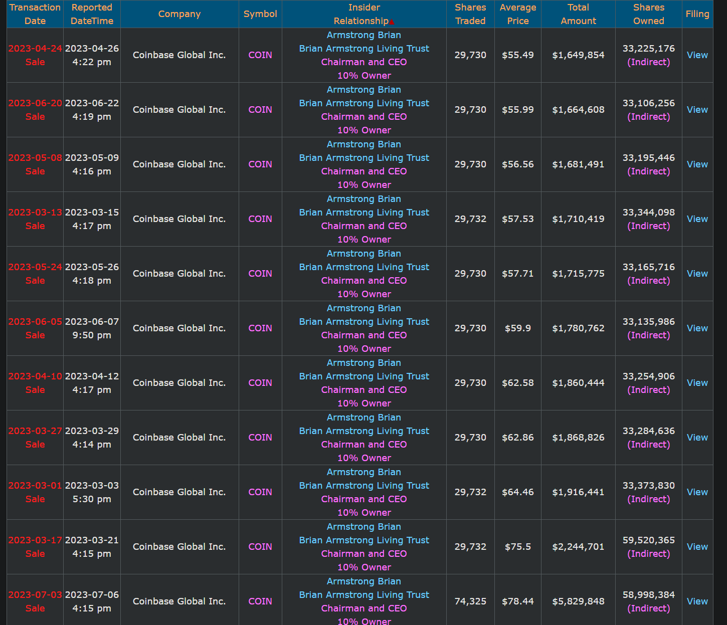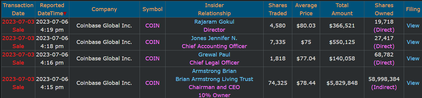 Dün itibariyle Coinbase CEO’su Brian Armstrong’da dahil olmak üzere birçok üst düzey borsa yetkilisinin Coinbase hisselerinde satışlar yaptığı gözlemlendi.