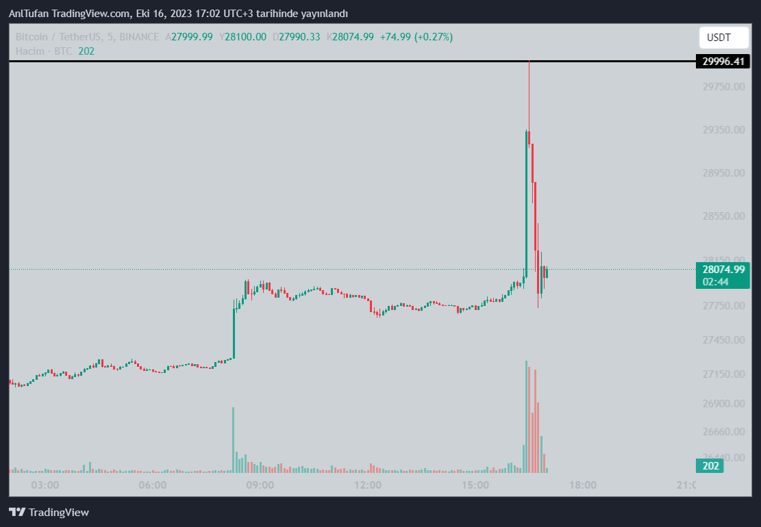 Geçtiğimiz dakikalarda ise BlackRock spot BTC ETF onayı haberinin sahte olduğunu doğruladı. Bu gelişmeler ile birlikte BTC 30 bin dolara yükselse de, dakikalar içerisinde yeniden 28 bin dolara geriledi.
