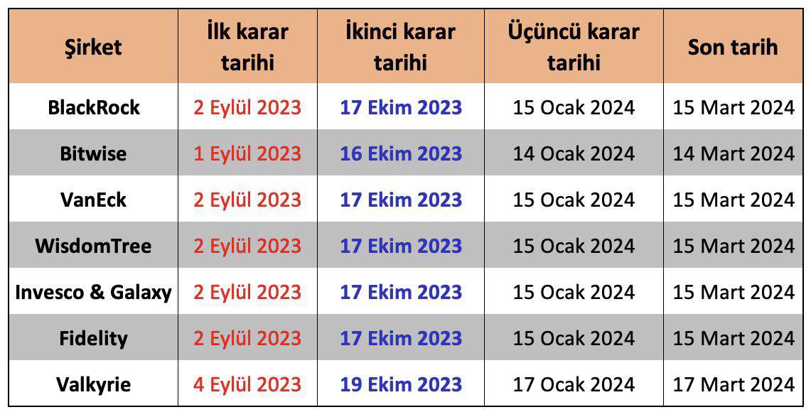 Şuan itibariyle kripto sektöründe gözler SEC’in 3. spot Bitcoin ETF karar dönemine çevrildi. Bu tarihinde 2024 yılının ocak ayının ortası olduğu görülüyor.