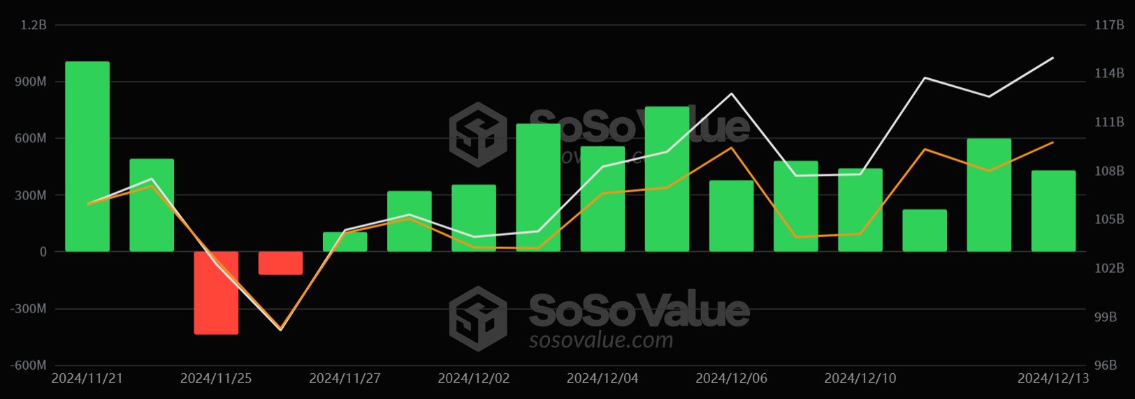 Bitcoin spot ETF’si 13 Aralık’ta 429 milyon dolarlık toplam net girişe sahipti ve net girişini 12 gün üst üste sürdürdü.
