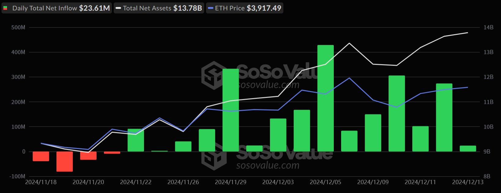 Ethereum spot ETF’si dün 23,6072 milyon dolarlık toplam net girişe sahipti ve 15 gündür net girişini sürdürdü.