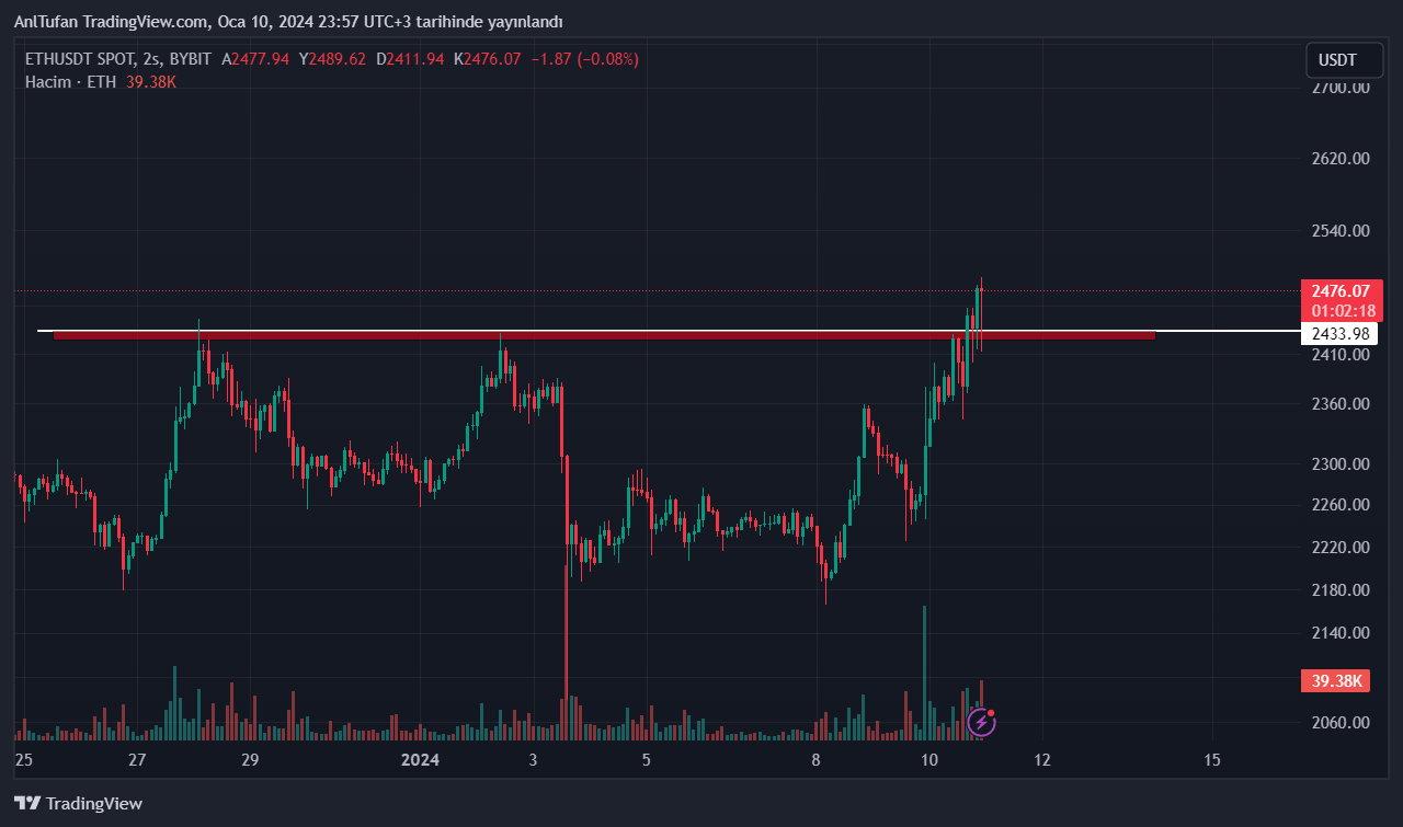 Spot Ethereum ETF onay söylentileri artarken, ETH’nin 2.433 dolar direncinin hemen üzerinde konumlandığı görülüyor.