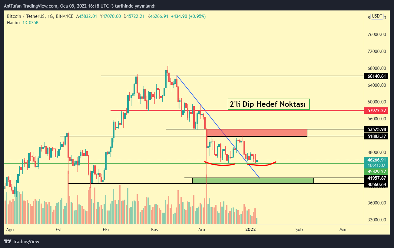 BTC’de 45.700 dolar desteği kırıldı diyerek short işleme girebilecek olan küçük yatırımcılara, 45.000 dolar desteğinden yukarı yönlü sert bir yükseliş sürprizi yaşatabilir. Bir çok long işlemin ve short işlemin likit olacağı senaryoda, yeni zirveler için hacimli ve doğru bir hareket gerçekleşmiş olacak.