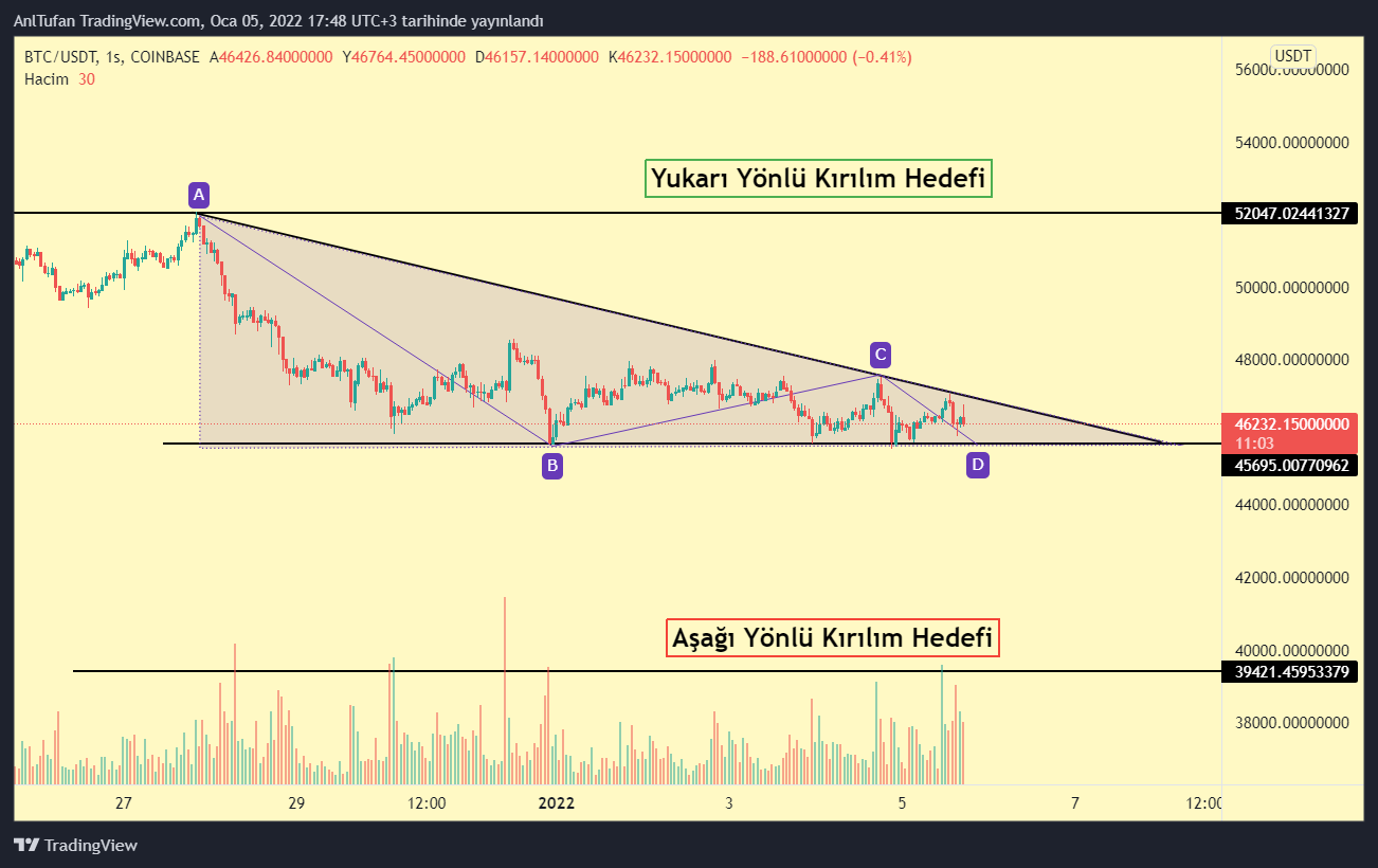 Üçgen formasyonu aşağı yönlü kırıldığı takdir de, 42.000 – 40.5000 dolar desteğinin hemen alt bölgesi olan 39.400 dolar seviyelerine kadar gerilemesi beklenen BTC, 42.000 – 40.5000 dolar desteğinin altındaki stopları da patlatıp, büyük bir hacimle tekrar yukarı dönebilir.