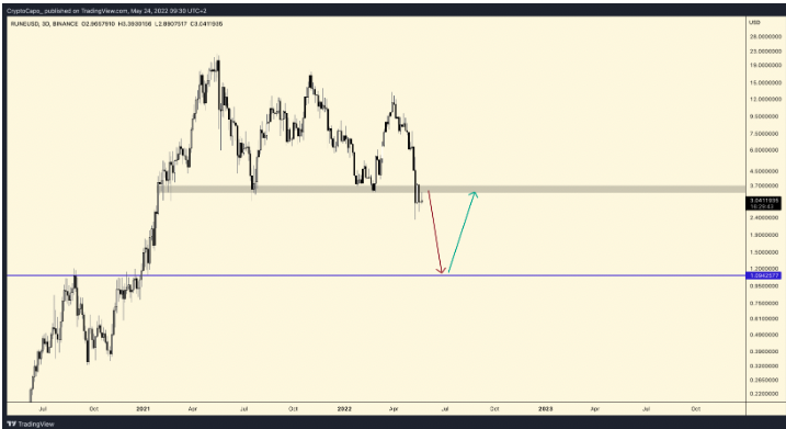 Capo, asıl yükselişin ise buradan sonra başlamasını bekliyor. 1 dolara kadar düşüşün devamında fiyatn 3,70 dolar bölgesine yeniden geleceğini düşünen analist, bunda bir hayli iddialı. RUNE ise hala 3 dolar desteğini korumakta ve düşüşü engellemekte.