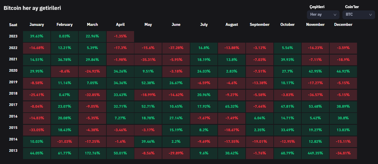 Bitcoin tarihini incelediğimizde, bugüne kadarki en büyük nisan düşüşü geçtiğimiz sene yüzde 17 ile gerçekleşti. Ondan önceki senelerde en fazla yüzde 3’lük bir düşüş yaşayan BTC, bu nisan ayında ise ciddi yükselişler yaşayabilir.