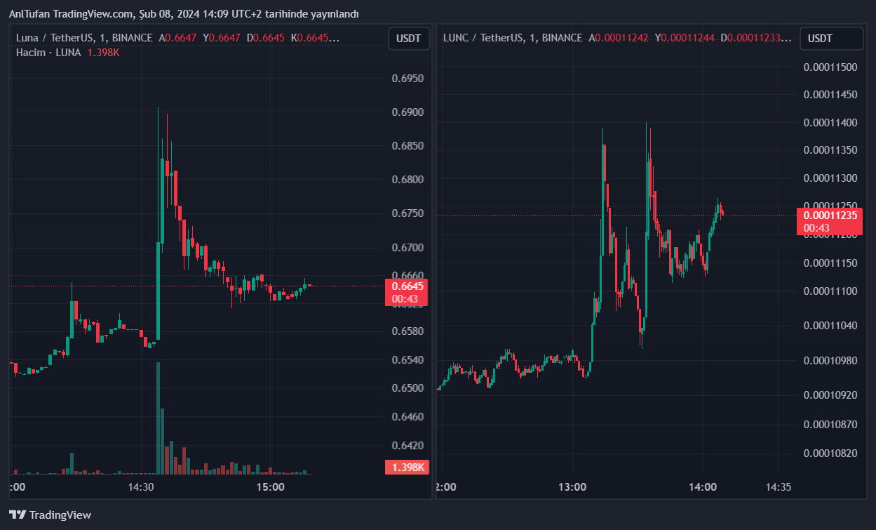 Bu gelişme sonrasında LUNA ve LUNC‘un volatil hareketler sergilediği görüldü. 2 projede de ani yükseliş ve düşüşler meydana geldi.