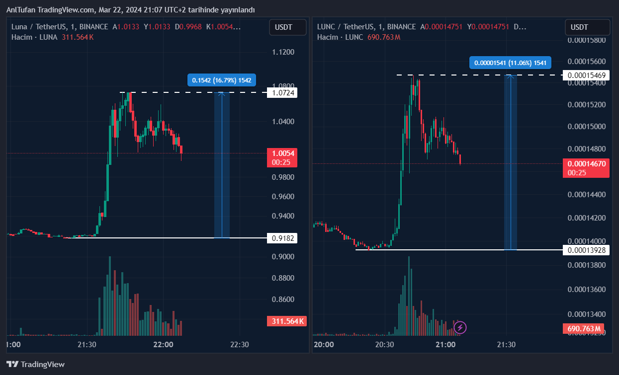 Bu gelişmeler sonucunda LUNA %15’lik bir artış yaşarken, LUNC‘un ise %10 oranında değer kazandığı gözlemlendi. 2 altcoin’de bu yükselişler sonrasında bir miktar değer kaybetti.