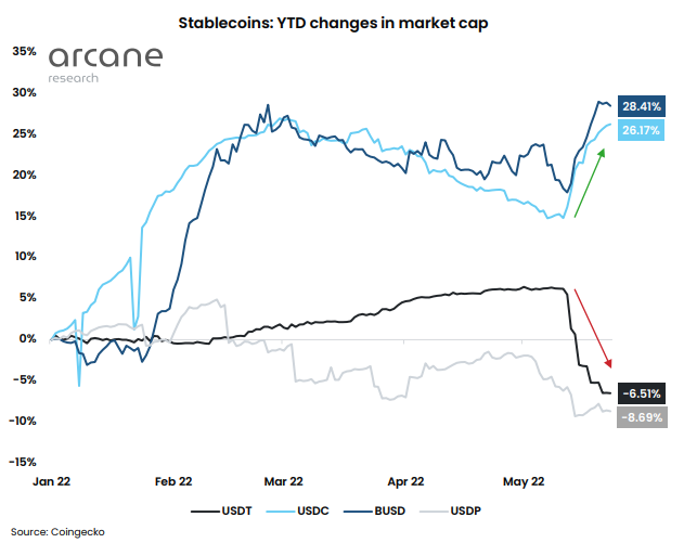 Veriler, en iyi stablecoin olan USDT’nin, UST’nin çöküşünün ardından piyasa hakimiyetinin bir miktar kaybettiğini kanıtlıyor. USDC ve BUSD gibi diğer stablecoinlerde ise oldukça keskin bir büyüme gözlemledi.