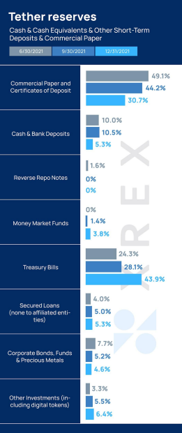 Tether, Eylül 2021’e kıyasla ise zaten az olan nakit rezervlerini daha da azalttı. XREX araştırmacıları Tether’in nakit ve banka depozitolarını %42 azalttığını vurguladı. Buna ek olarak ticari tahviller %21 azaldı ve 24 milyar dolara çekildi.
