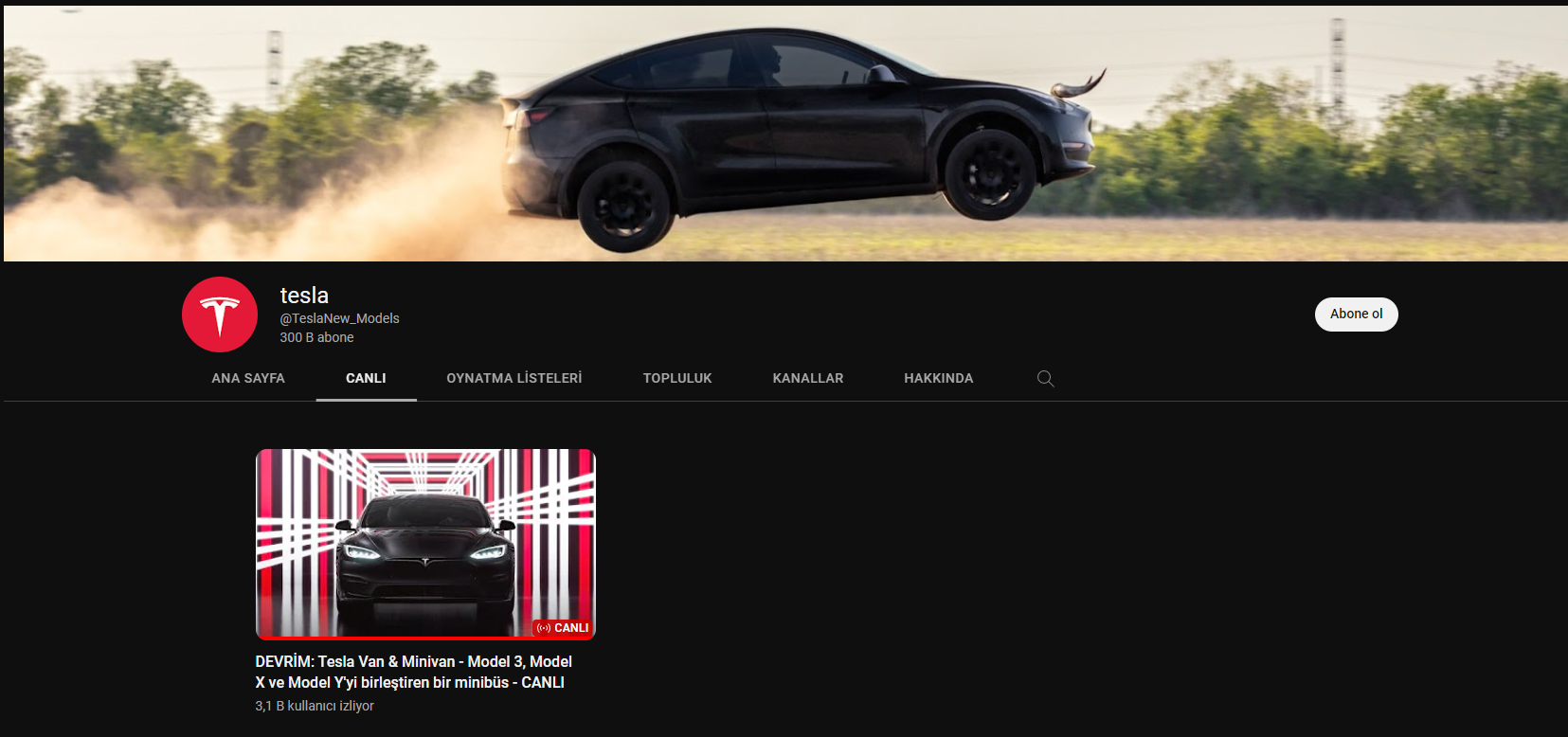 Trabzonspor’un Youtube kanalının ismini kısa bir süre içerisinde “Tesla” olarak değiştiren hackerlar, hızlı bir şekilde kripto para dolandırıcılığı yapmaya başladı.