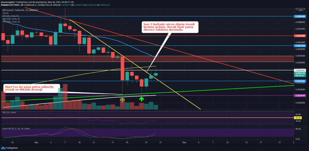 Destek aldığı seviyeyi 23 Mayıs günü ikinci defa deneyen BTT, takip eden son üç günde güzel bir yükseliş yakalayarak 3 haftalık düşüş trendini gösteren sarı trend çizgisini kırmayı başardı. Bugün 40.000 dolar seviyesinden geri çekilen BTC ile birlikte kırılım momentumunu yakalayamayan BTT, MA100 (0.00473 Dolar) ve yatay direnç seviyesi olan 0.00443 dolarda satış baskısıyla karşılaşıyor.