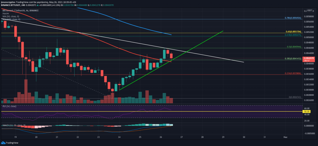 Mart ayından bu yana çizilen yükseliş trendine nokta atışı bir iğne bırakan BTT, 200 günlük hareketli ortalama olan 0.00244 dolar civarından destek aldı.