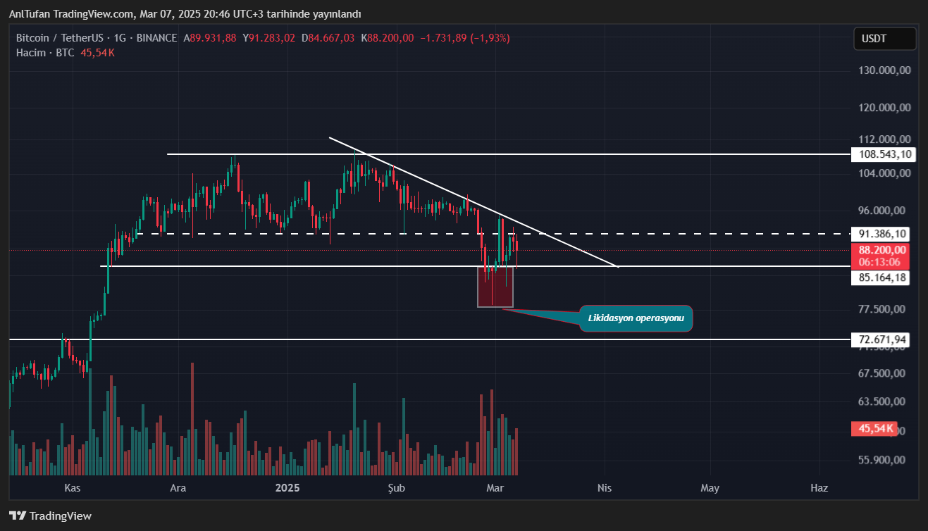 Gece saatlerinde ABD Başkanı Trump’ın Bitcoin rezerv kararı sonrasında BTC’nin 85 bin dolar desteğine gerilediği görülmüştü. Şuan itibariyle bu destekte tutunan ve tepki alan BTC, gözünü 91.386 dolardaki dirence çevirmiş olabilir.