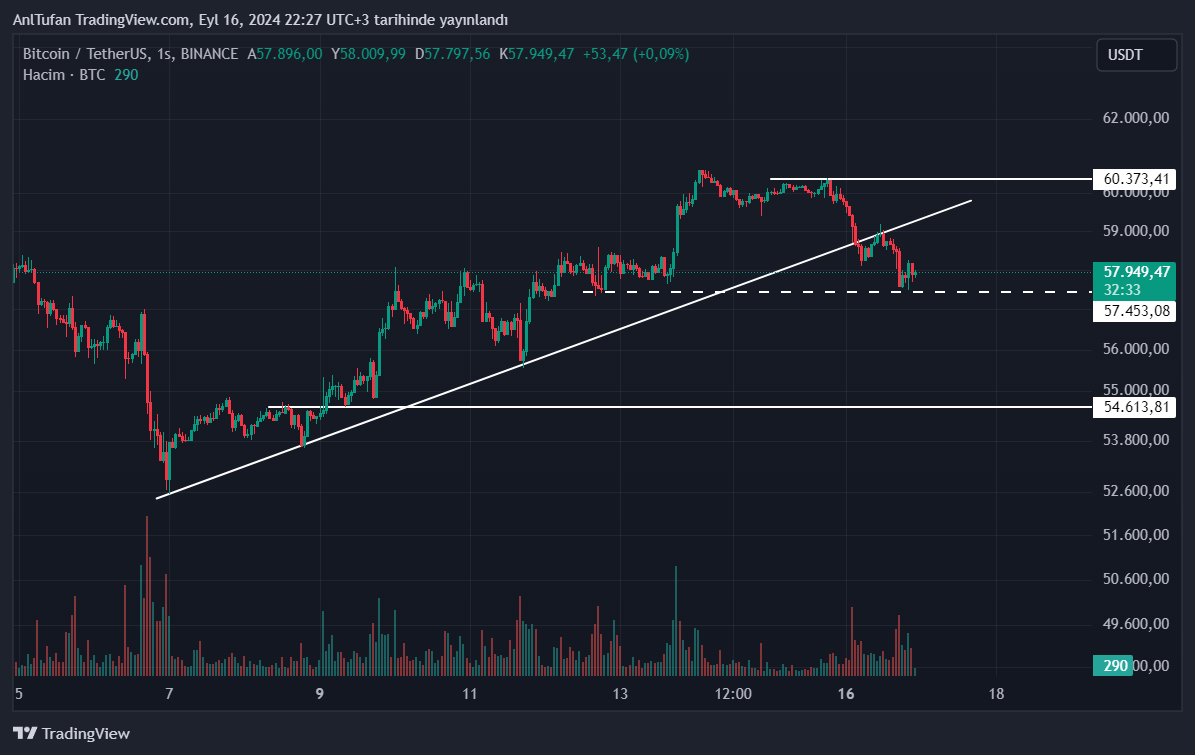 Okurlarımızın önümüzdeki günlerde Bitcoin’in (BTC) 60 bin dolar seviyesini aşamaması ve 57.500 dolar desteğini kaybetmesi halinde 54.600 dolara kadar gerileyebileceğini unutmaması gerekiyor.