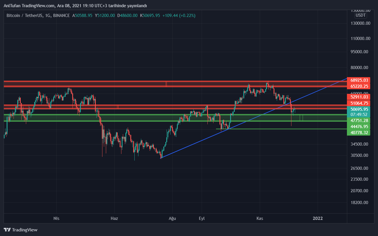 52.900 – 51.000 dolar direnç seviyesi üzerinde 4 saatlik ve günlük kapanışlar yapması durumunda tekrardan yükseliş trendine girecek olan Bitcoin, bu direnç seviyesi altında kaldığı her an altcoinler için bir tehlike olarak göze çarpıyor.