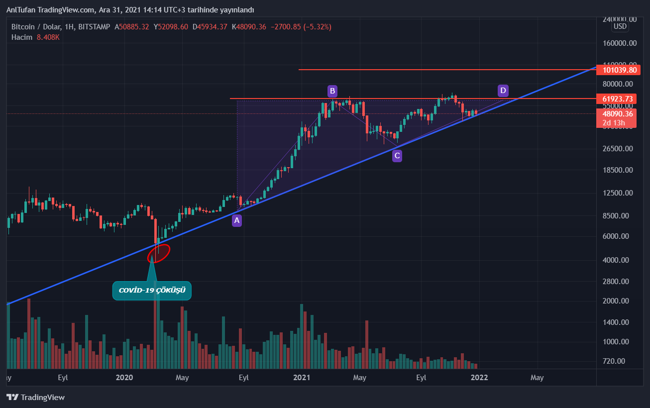61.923 dolar seviyesinin mevcut formasyonun kırılım noktası olacağını göz önüne alırsak, bu seviyenin kırılımıyla 100.000 dolar hedef seviyesine kadar sert yükselişlerin yaşandığını görebiliriz.