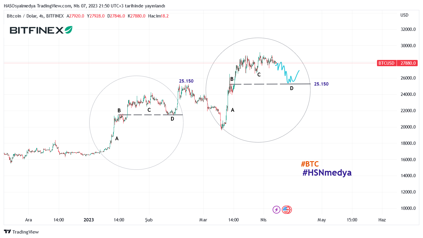 “Görsel olarakta anlamanızı kolaylaştırmak adına Harflerle şekillendirdim. Beklentim, btc’nin önce D bölgesi olarak gösterdiğim 25.150 dolar seviyelerine gerilemesi. Bu bölgeden onay alıp yükselmesi daha kolay olacaktır.”
