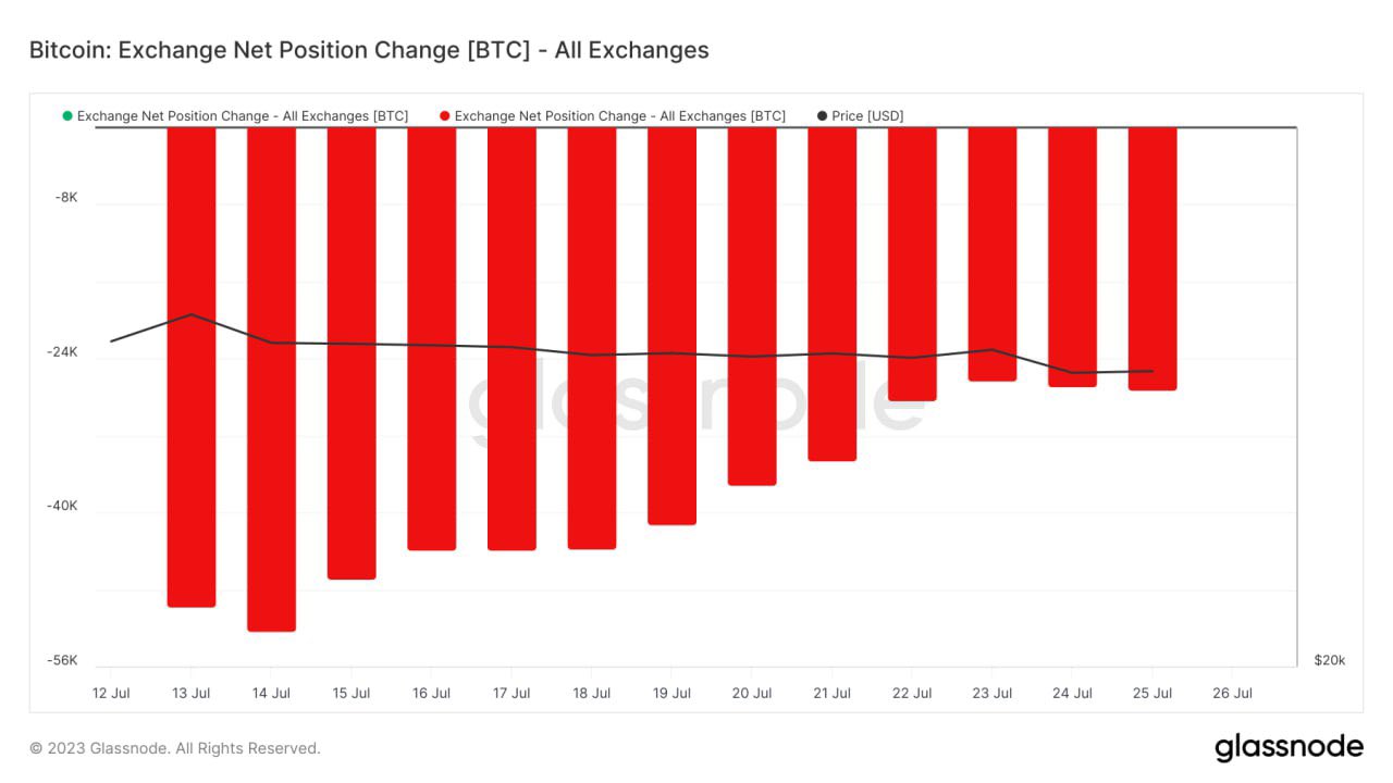 Glasnode’un “borsalardaki net BTC adetindeki değişimler” verisini inceleyen Poyraz, borsadan çıkan BTC’de düşüşlerin olduğunu vurguluyor.