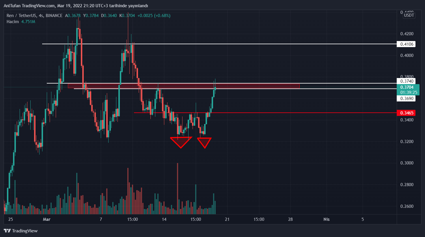 4 saatlik grafik üzerinde ikili dip formasyonu oluşturan REN, bu formasyonun boyun çizgisi olan 0.3465 doları kırdıktan sonra volatil bir yükseliş sergiledi.