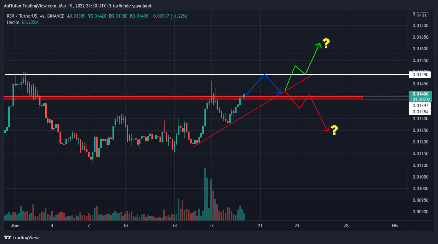 Kırmızı ok ile gösterdiğimiz düşüş senaryosunda ise 0.01397 – 0.1385 dolar desteğine kadar düşecek olan RSR, bu destek seviyesinde tutunamayarak çok daha sert düşüşler yaşayabilir.