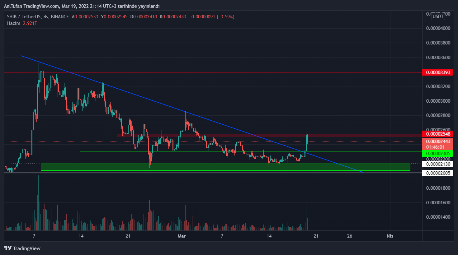 Bu yükselişinde an itibariyle 0.2550 dolar direncine takılmış olan Shiba Inu, bu seviyeyi kırması durumunda ise 0.00003400 dolar direncine kadar yükseliş yapabilir.