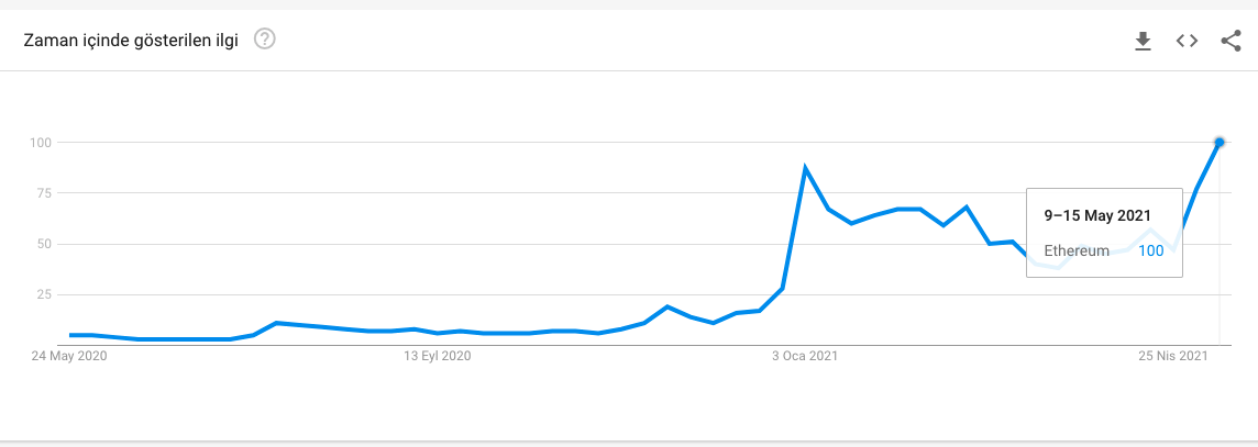 Son 12 ayda Türkiye içerisinde Ethereum’a gösterilen ilginin, hafif bir düşüş dışında devamlı olarak arttığı görülebilmekte. Ethereum kesinlikle lider kripto para birimi Bitcoin’den sonra Türkiye’de en çok konuşulan ve ilgi duyulan kripto paralar arasında yer alıyor.