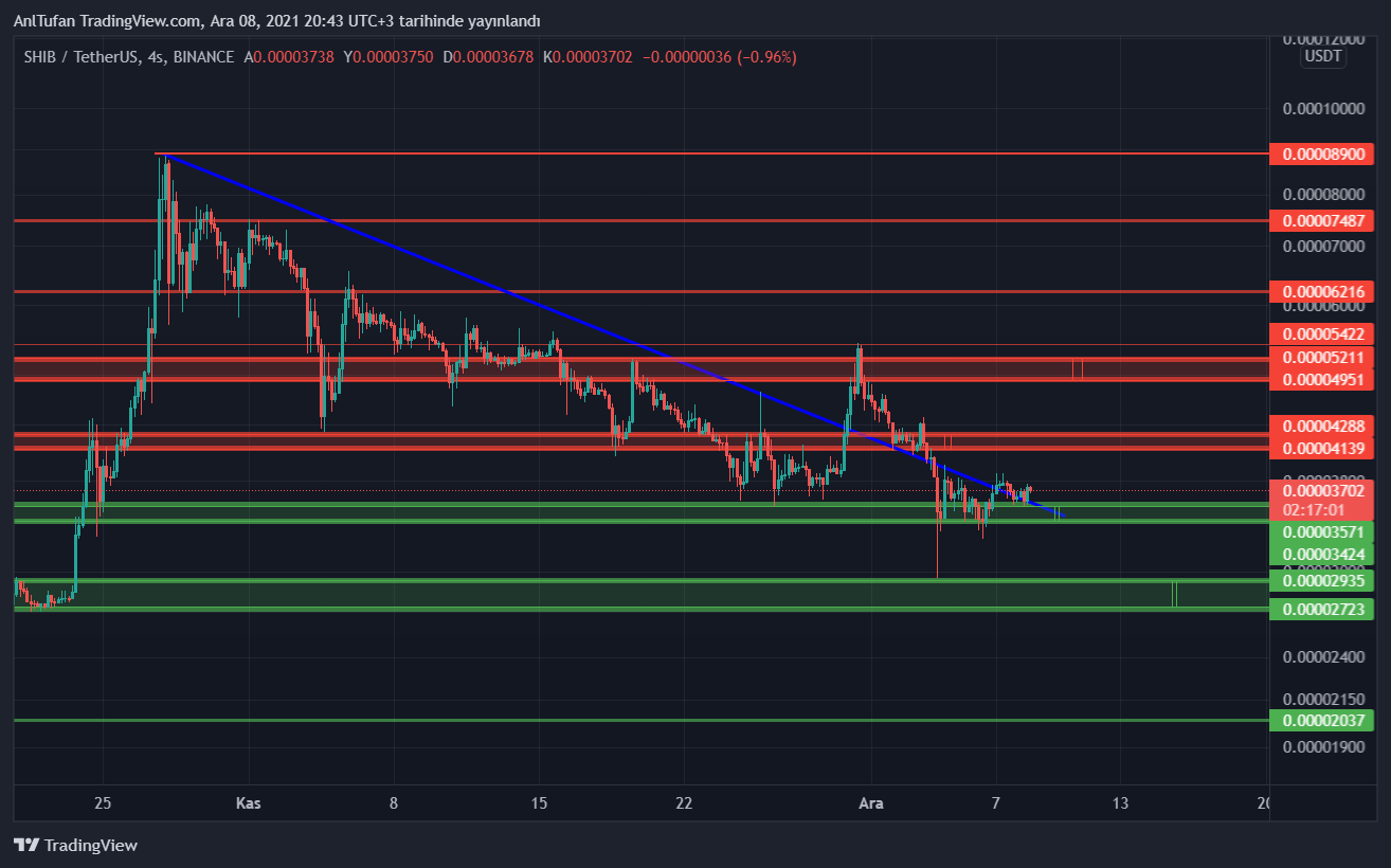 0.00003571 – 0.00003424 dolar destek seviyesini aşağı yönlü kırması ve düşen trendinin tekrar altına sarkması halinde, 0.00003000 dolar destek seviyesine kadar gerileyebilecek olan Shiba Inu’nun, piyasanın hareketlenmesiyle yükselişe geçmesi beklenmekte.