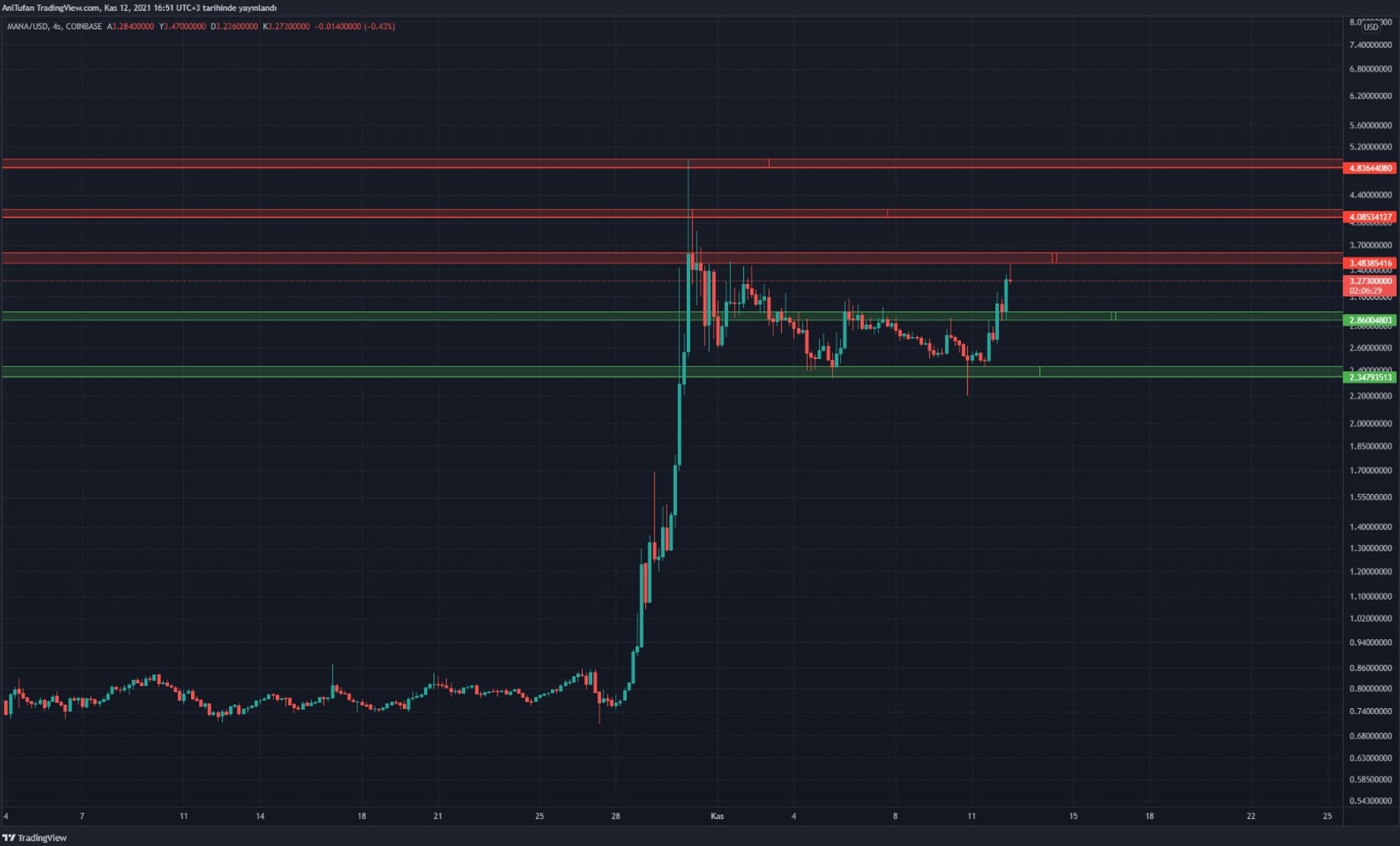 3.48 dolar direncinden reddedilmiş gibi duran MANA, bu reddedilme devam ettiği sürece 2.86 dolar seviyesindeki destek seviyesine kadar bir gerileme görebiliriz. 3.48 dolar direncini kırıp desteğe çevirdiği takdir de çok güzel bir alım noktasında olacak olan MANA, 4 dolar direncine kadar yükselebilir.