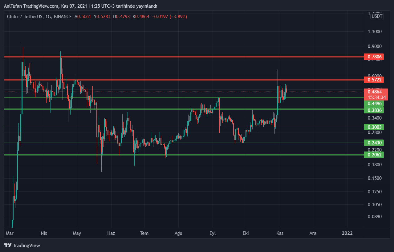 CHZ yatırımı yapmış ve nerede satacağını bilmeyen kripto para yatırımcıları 0.5722 dolar ana direnç seviyesi uygun bir tercih olabilir. Bu seviyede portföylerinde ki CHZ’nin bir miktarını satması doğru olarak gözüküyor. Kalan CHZ’leri için 0.7806 dolar direnç seviye beklenebilir gibi duruyor.