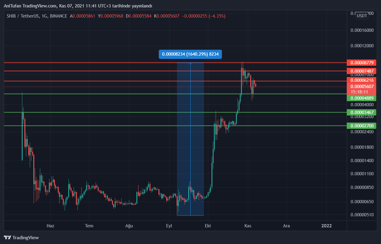 Shiba Inu 0.00006216 dolar direncine tekrar yükseldiği takdir de yatırımlarının bir kısmını satabilecek kripto para yatırımcıları bu direncin kırılmasıyla birlikte, Shiba’nın 0.00007487 dolar direncine kadar bir yükseliş görmesinin çok muhtemel olduğunu bilmeliler.