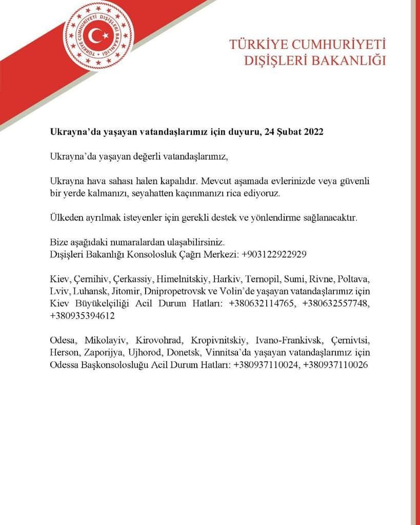 Dışişleri Bakanlığı, Ukrayna’dan ayrılmak isteyen Türk vatandaşları için gerekli destek ve yönlendirme sağlanacağını duyurdu.